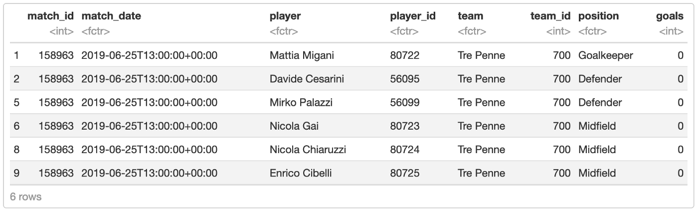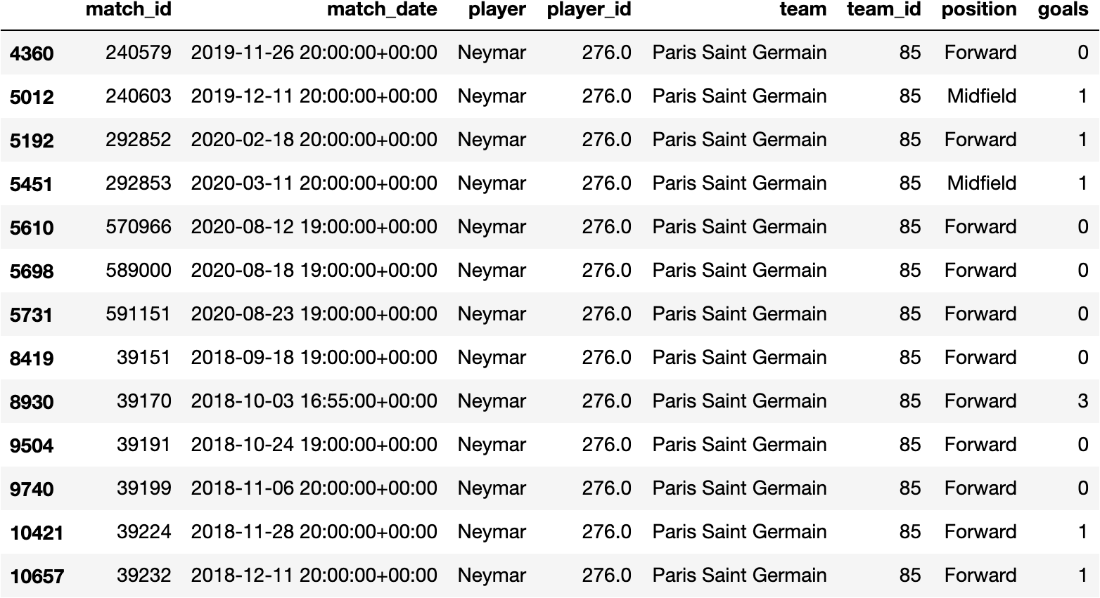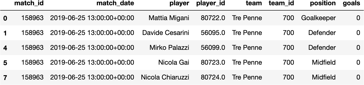 First let’s load our data. I collected data from UEFA Champions League for 2018 and 2019–2020, each row is a participation of a player in a match, with which position they were on this match, and how much goals they scored. Players that were in substitution bench during the match but never entered the field are not included