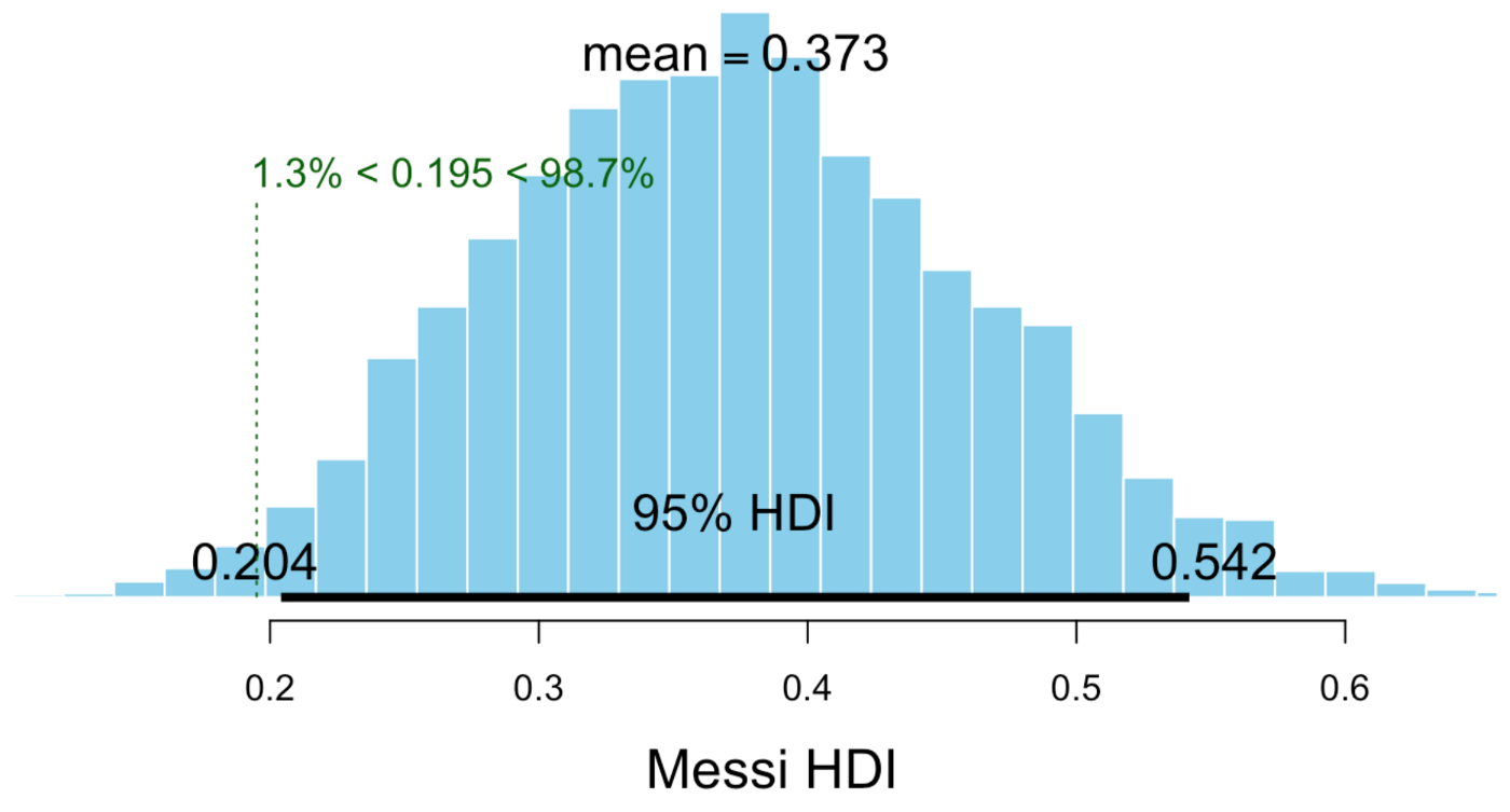 Well the mean is similar to what we got using Logistic Regression, 0.38 vs 0.328 here. But is he conclusively better than average? Almost but no!* The lower bound for Neymar is 0.148, which is inside the average range, so it seems like he is probably better, but variance is quite high, maybe it was just luck all this time? What about Messi?