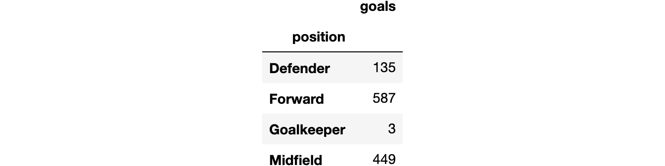1 | df[['position', 'goals']].groupby('position').sum() |
