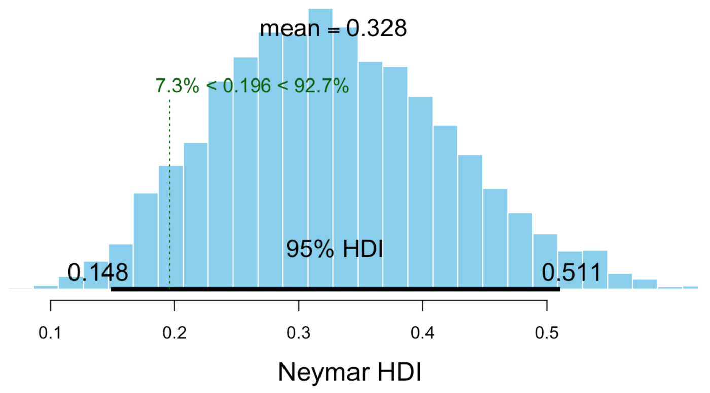 Between 0.159 and 0.196. Here you see a cool advantage of using Bayesian methods: it’s common to look at distributions rather than point estimates, so we can have an idea of our uncertainty. What about Neymar, is he in this range? Or is he conclusively better than average?
