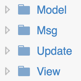 Also, in each one we have a file called Main.elm, which combines the other files, e.g. the Update/Main.elm is a combination of all other Updates in the project, the Model/Main.elm is a combination of all other models in the project, and so on.